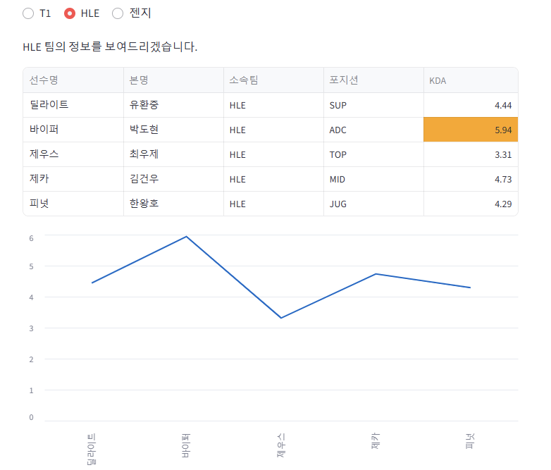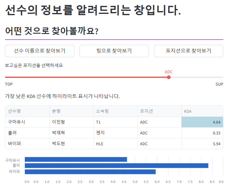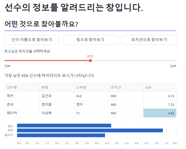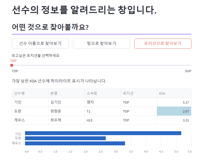 어떤 선수의 KDA가 제일 높은지 확인할 수 있게 했습니다.