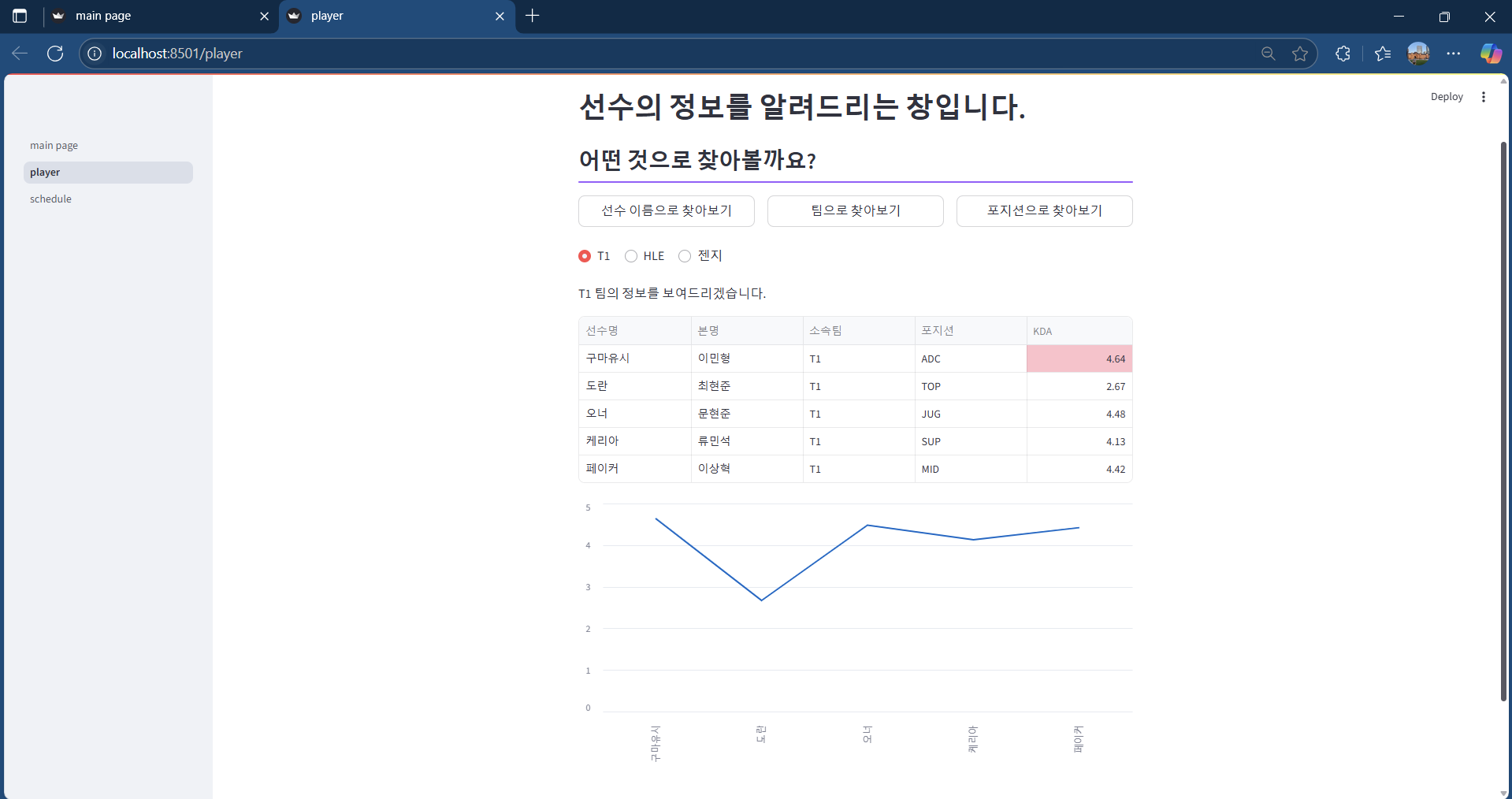 해당 선수 닉네임, 본명, 소속팀, 포지션, KDA가 출력되게 하였습니다.