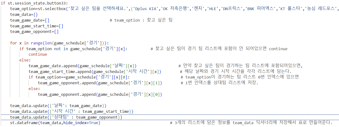 일단 날짜와 시간 당 경기에 참여하는 두 팀을 리스트에 같이 묶었습니다.