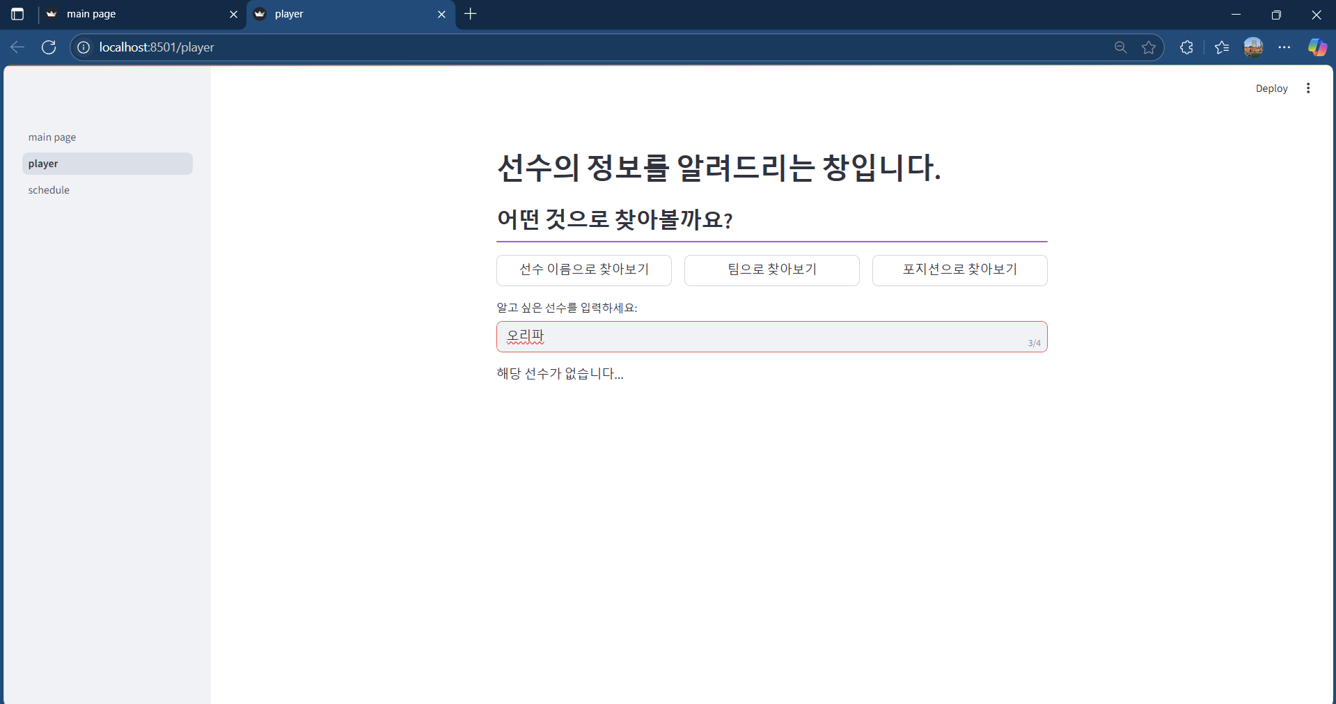 선수 정보는 총 3가지로 찾을 수 있도록 하였습니다.